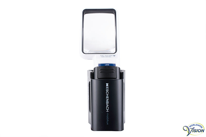 Eschenbach Mobilux LED 15113 10D, compact hand magnifier with SMD LED illumination of 6900 K and rectangular aspheric PXM lens of 75 x 50 mm, 3.5 X magnification, colour black/white, including protection pouch for lens, 3 light colour filters and 2 AA batteries.Very lightweight and easy to carry around.Optional stand art. 251642 to use in horizontal or vertical position.