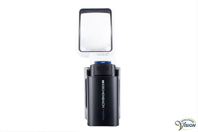 Eschenbach Mobilux LED 15114 16D, compact hand magnifier with SMD LED illumination of 6900 K and rectangular aspheric PXM lens of 75 x 50 mm, 4 X magnification, colour black/white, including protection pouch for lens, 3 light colour filters and 2 AA batteries.Very lightweight and easy to carry around.Optional stand art. 251642 to use in horizontal or vertical position.