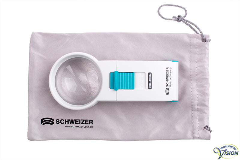 Schweizer Ökolux+ Mobile LED 134242 24D, compact illuminated hand magnifier with SMD LED of 4500 K and aspheric lens of 55 mm(optical 52.5), 6 X magnification, colour white, including protection/cleaning pouch, excluding 3 AAA batteries.Very lightweight and easy to carry around