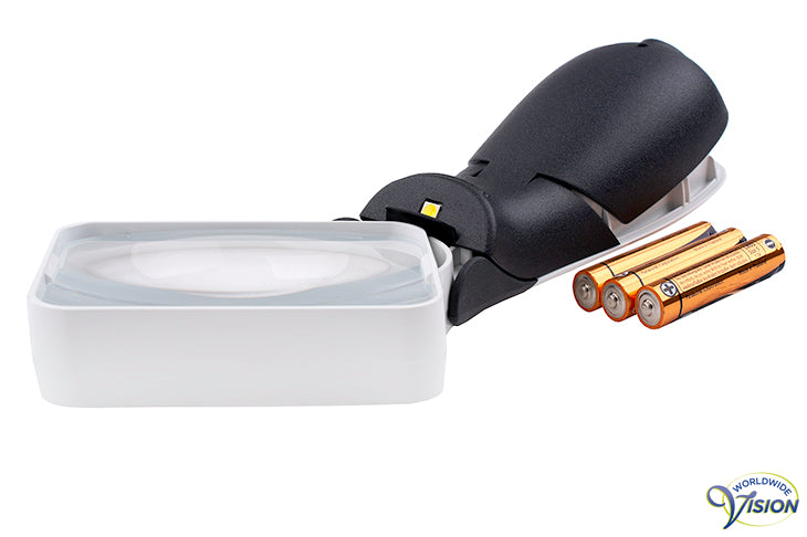 Schweizer ERGO-Lux MP Mobile LED 164102 10D portable lifestyle hand magnifier with SMD LED-illumination of 4500 K and two light brightness options, aspheric angled lens of 75 x 50 mm, 2.5 x magnification, colour white/darkgrey, including protection/cleaning pouch, excluding 3 AAA batteries.