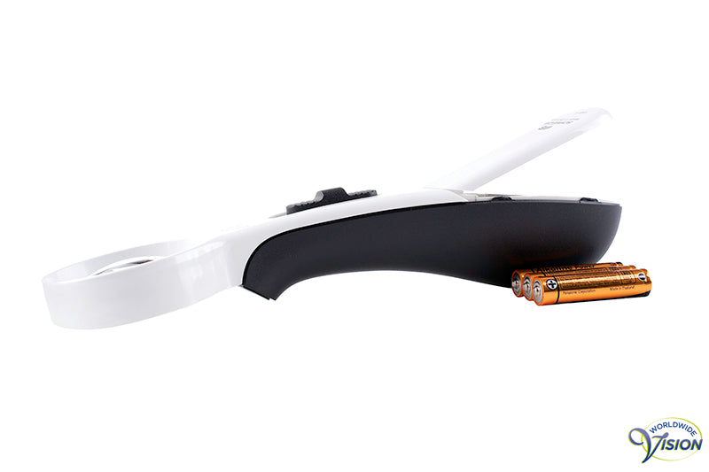 Schweizer ERGO-Lux MP LED 171202 20D ergonomic, lightweight hand magnifier and optional stand magnifier with SMD LED illumination of 4500 K and two light brightness options, aspheric lens of 55 mm, 5 x magnigication, colour white/dark grey, excluding 3 AAA batteries.Optional magnetic base for use as stand magnifier.
