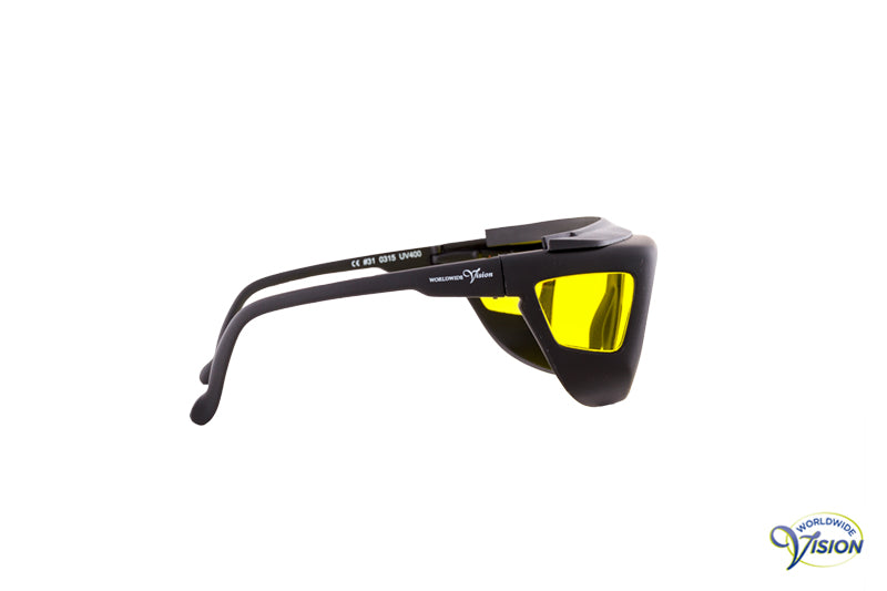 Spectra-Shield 450 fitover sun/side filter glasses (small model), 100% protection against UV-a, b and c radiation up to 400 Nm, yellow lenses and sides with black frame, allows 87% light through, including pouch. Suitable for sun-ski-sport and people with glaucoma, pre-cataract and night blindness.