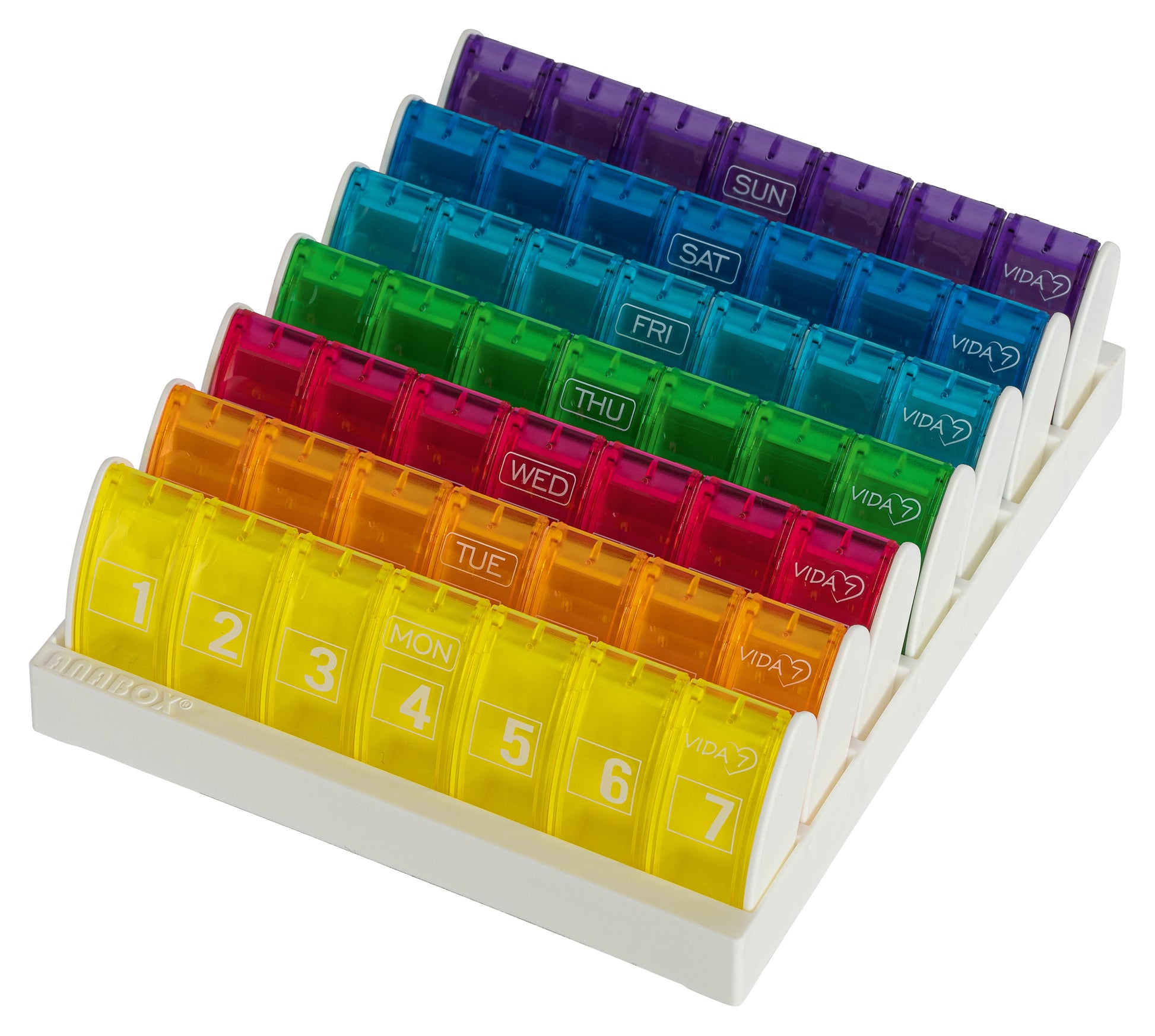 Medicijnbox met 7 dagboxen in een houder voor iedere dag van de week. Iedere dagbox heeft 7 vakken met een afsluitbaar dekseltje.