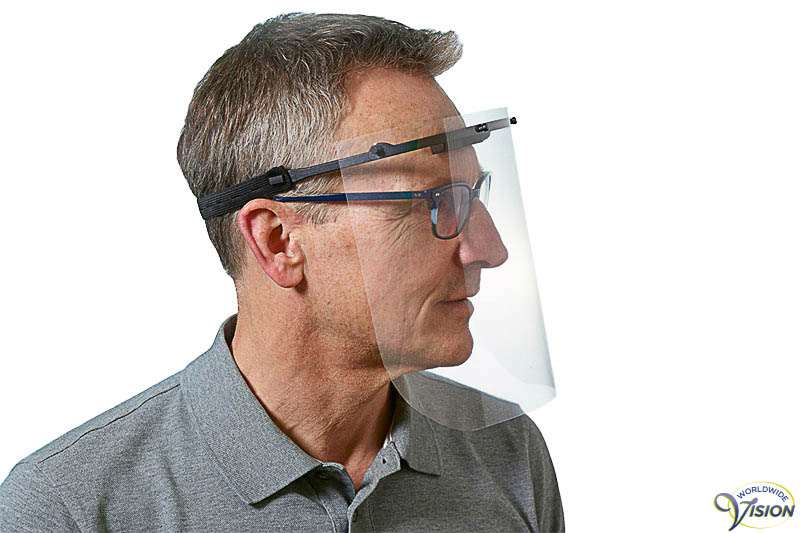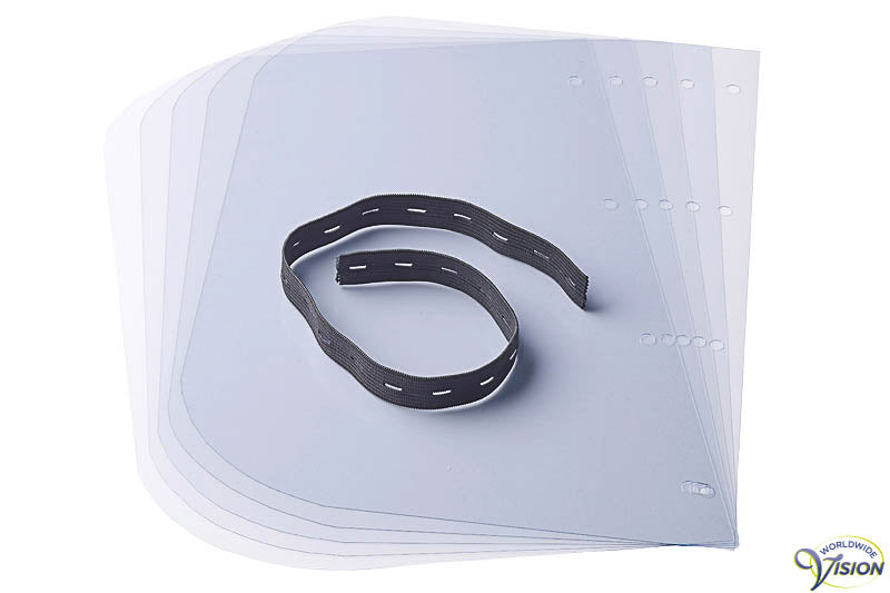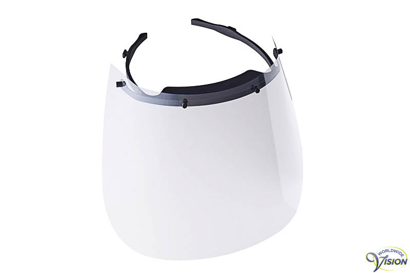 Schweizer beschermkap voor het gezicht met verstelbare hoofdband en langwerpig transparant vizier, ideale hygiënische bescherming van de ogen, neus en mond. De herbruikbare beschermkap kan worden gereinigd met standaard desinfectiemiddelen, gewicht 40 gram, afmetingen H 210 x B 185 x D 180 mm, set bestaande uit 1 x beschermkapdrager, 5 x beschermkappen en 1 x verstelbare hoofdband.
