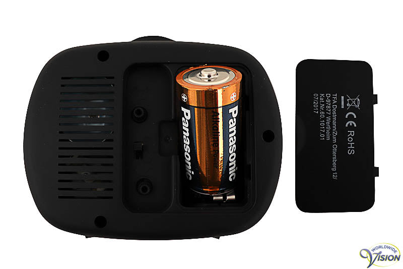 Wekker quartz voor senioren en slechtzienden met zwarte wijzerplaat.