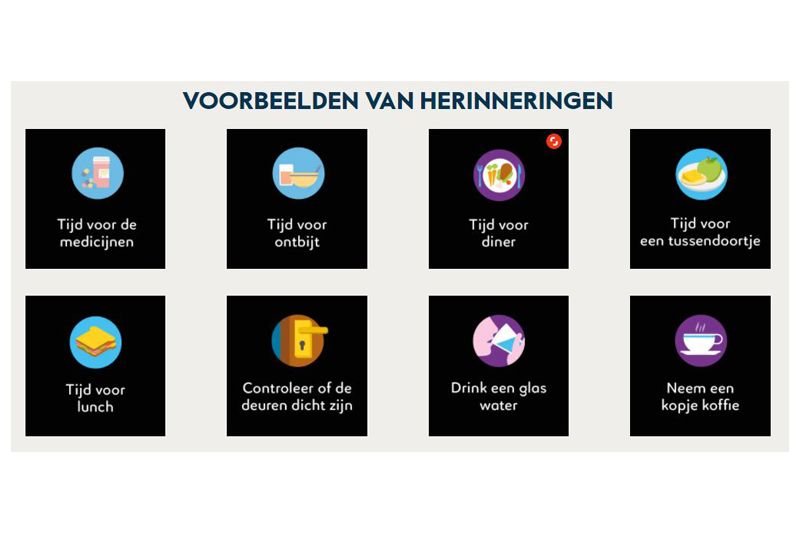 Deze unieke kalenderklok doet echter veel meer dan alleen de tijd aangeven. Zo heeft deze sprekende klok verschillende herinneringsberichten. Deze berichten kunnen worden ingesteld om dagelijks, wekelijks, eenmalig of op weekdagen (ma t/m vrij) en het weekend (za en zo) uitgesproken te worden of als alarmsignaal af te gaan. Ook verschijnt er op de klok een bijbehorende plaatje ter verduidelijking. Voorbeelden van herinneringsberichten zijn bijvoorbeeld: drink een glas water, tijd voor de medicijnen of geplande gebeurtenissen zoals doktersafspraken of familiebezoeken. Mensen reageren vaker beter op een stem die ze kennen. Daarom is het mogelijk om zelf berichten in te spreken en deze op de gekozen tijd te laten afspelen.