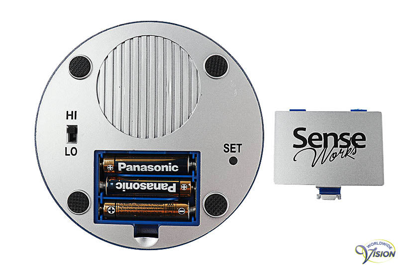 Alarmklok SenseWorks met slechts één zeer grote blauwe drukknop, Nederlandssprekend tafelmodel, met analoge tijd, alarm, dag en kalender uitspraak bv. "De tijd is vijf over twaalf in de middag", instellingen als tijd, alarm en datum worden met zeer professionele stem geheel uitgesproken, zeer eenvoudige bediening d.m.v. één grote drukknop, volumeschakelaar, gewicht circa 170 gram, diameter 113 x 60 mm hoog, kleur blauw/zilver, excl. 3 AAA batterijen.