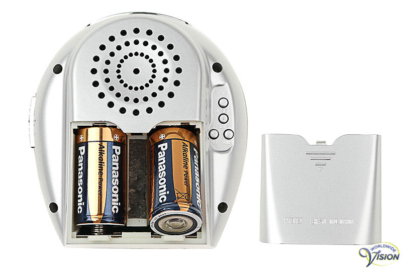 Alarmklok SenseWorks zendergestuurd Nederlandssprekend, tafelmodel met analoge tijd-, alarm-, dag en kalender uitspraak bv. "De tijd is vijf over twaalf in de middag", analoge verlichte witte wijzerplaat van 95 mm met groene fluoriserende wijzers en 12 zwarte cijfers, absolute nauwkeurigheid, automatische omschakeling van zomer- en wintertijd, instellingen als tijd, alarm en datum worden met zeer professionele stem geheel uitgesproken, volumeschakelaar, gewicht circa 359 gram, afmetingen H 130 x B 120 x D 75 mm, kleur zilver, excl. 2 C batterijen.