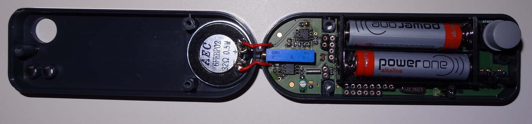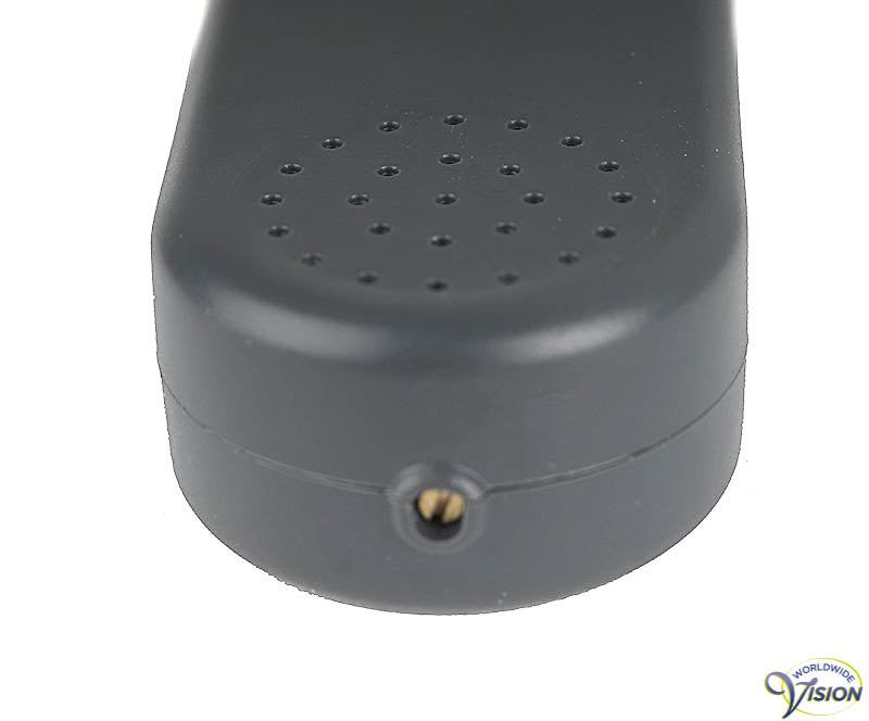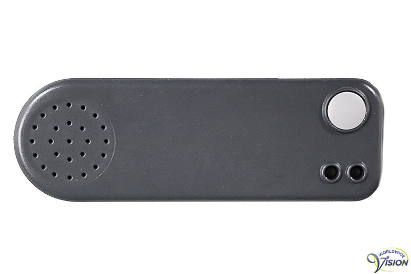 Alarmklok Easyvox Combi, digitaal en analoog Nederlandssprekend (op aanvraag zelfs in het Fries of Frans), tijd-, alarm-, dag- en kalenderfuncties worden duidelijk en met een natuurlijke stem uitgesproken, melding analoge tijd bv. "Een over half zes 's-middags"", volumeregeling, gewicht circa 77 gram, afmetingen L 102 x B 35 x H 19 mm, kleur antraciet met lichtgrijze knop, incl. halskoord en 2 AAA batterijen.