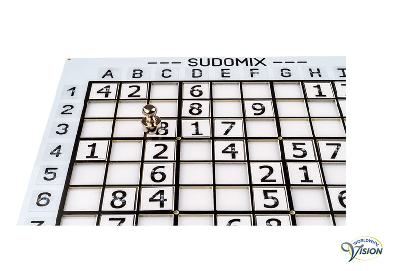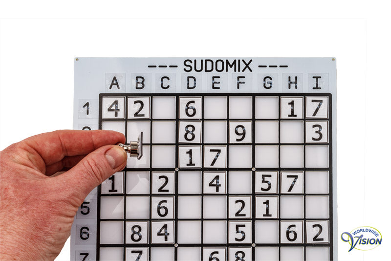 SudoMix voor blinden, cijferpuzzel voor 1 of meer spelers, bord in grootletter en braille met diepliggende velden en 81 magnetische witte blokjes van 17 x 17 mm met zwarte cijfers van 14 mm hoog en braille, bordmaat 22 x 21 cm, incl. magnetisch oppakstaafje en kunststof opbergdoosje.